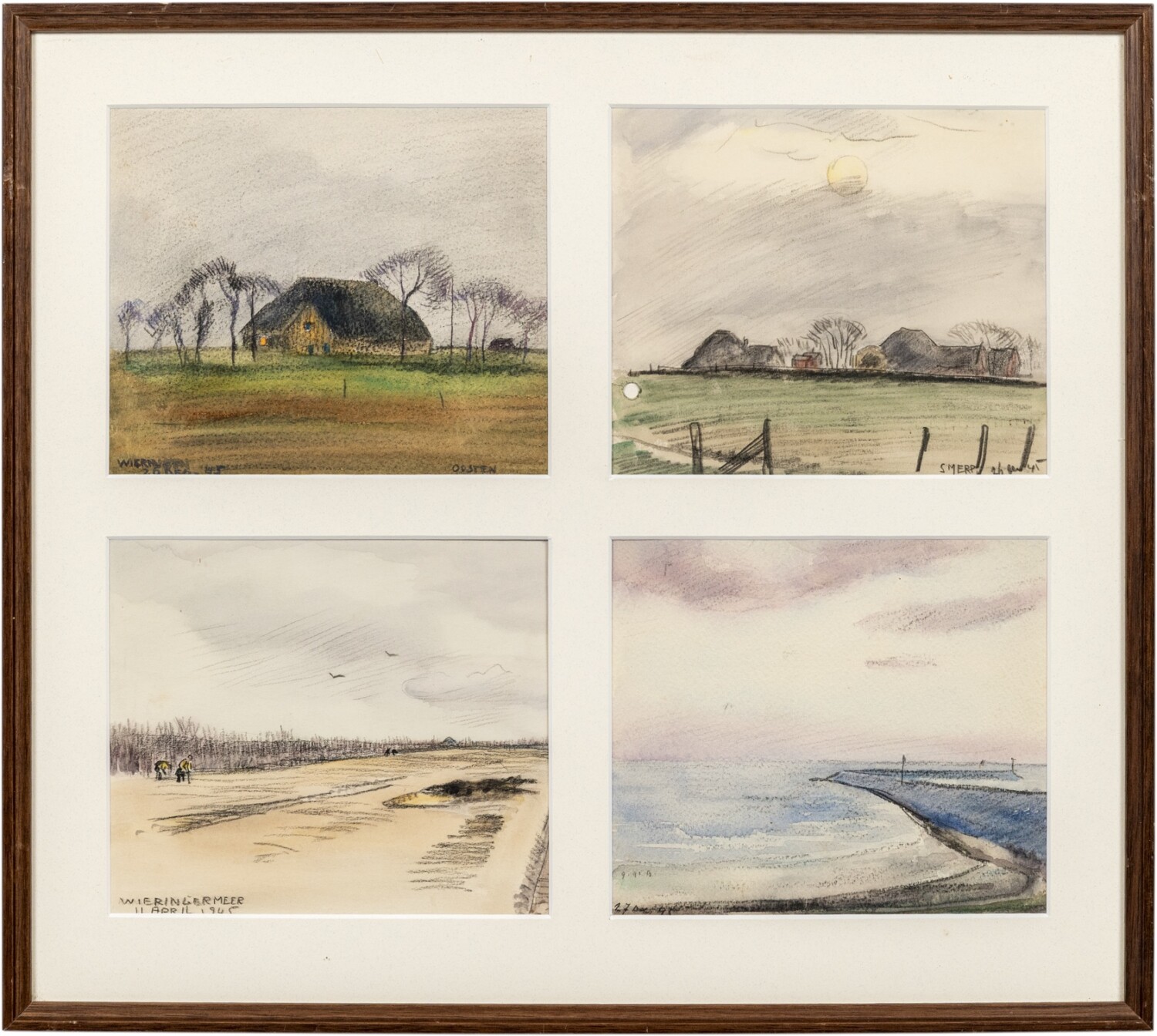 Beschrijving Verzameling met vier landschappelijke schetsen met agrarische en dorpsgezichten rond Wieringen en de Wieringermeerpolder. De tekeningen tonen boerderijen, landarbeiders, het dorp Smerp en een gezicht op Den Oever, sober en observerend vastgelegd.